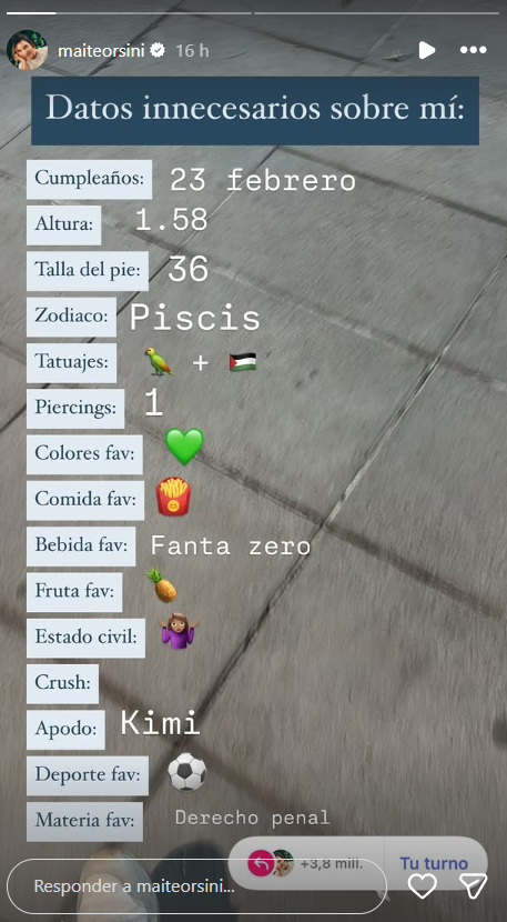 Maite Orsini volvió a encender rumores sobre un posible quiebre con Jorge Valdivia, luego de compartir en sus historias de Instagram una plantilla viral titulada “Datos innecesarios sobre mí”. Al llegar al ítem “Estado civil”, la diputada respondió únicamente con un emoji de mujer encogiéndose de hombros, lo que fue interpretado por muchos como una señal de incertidumbre en su relación.